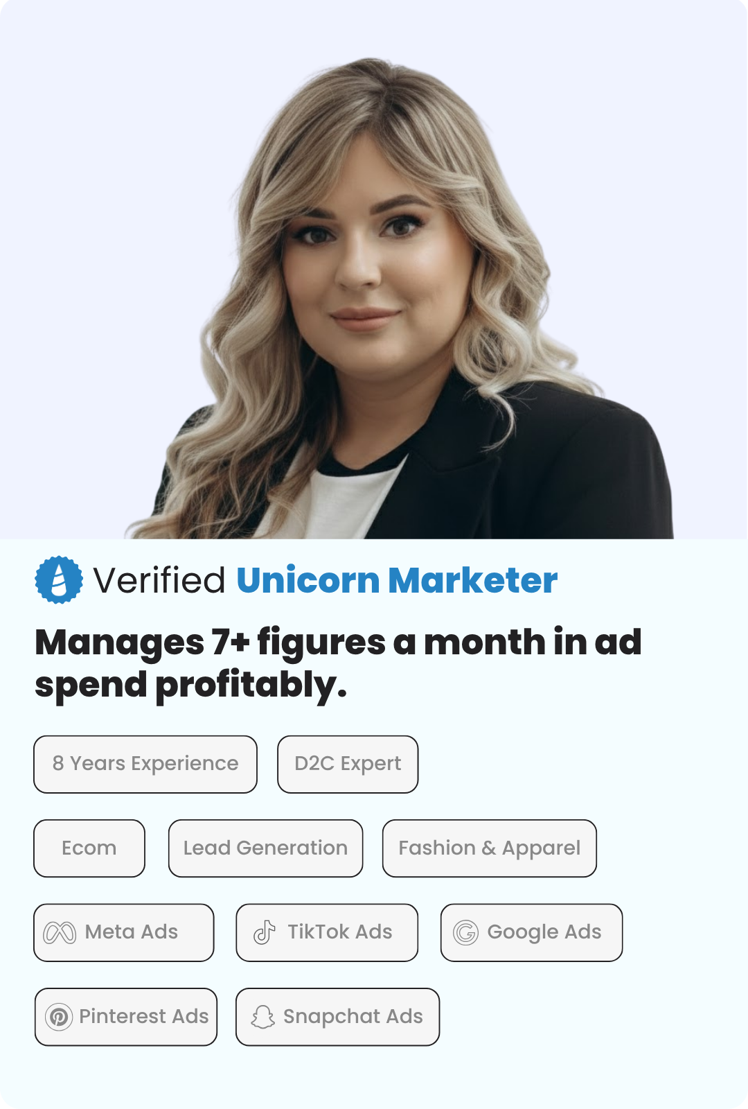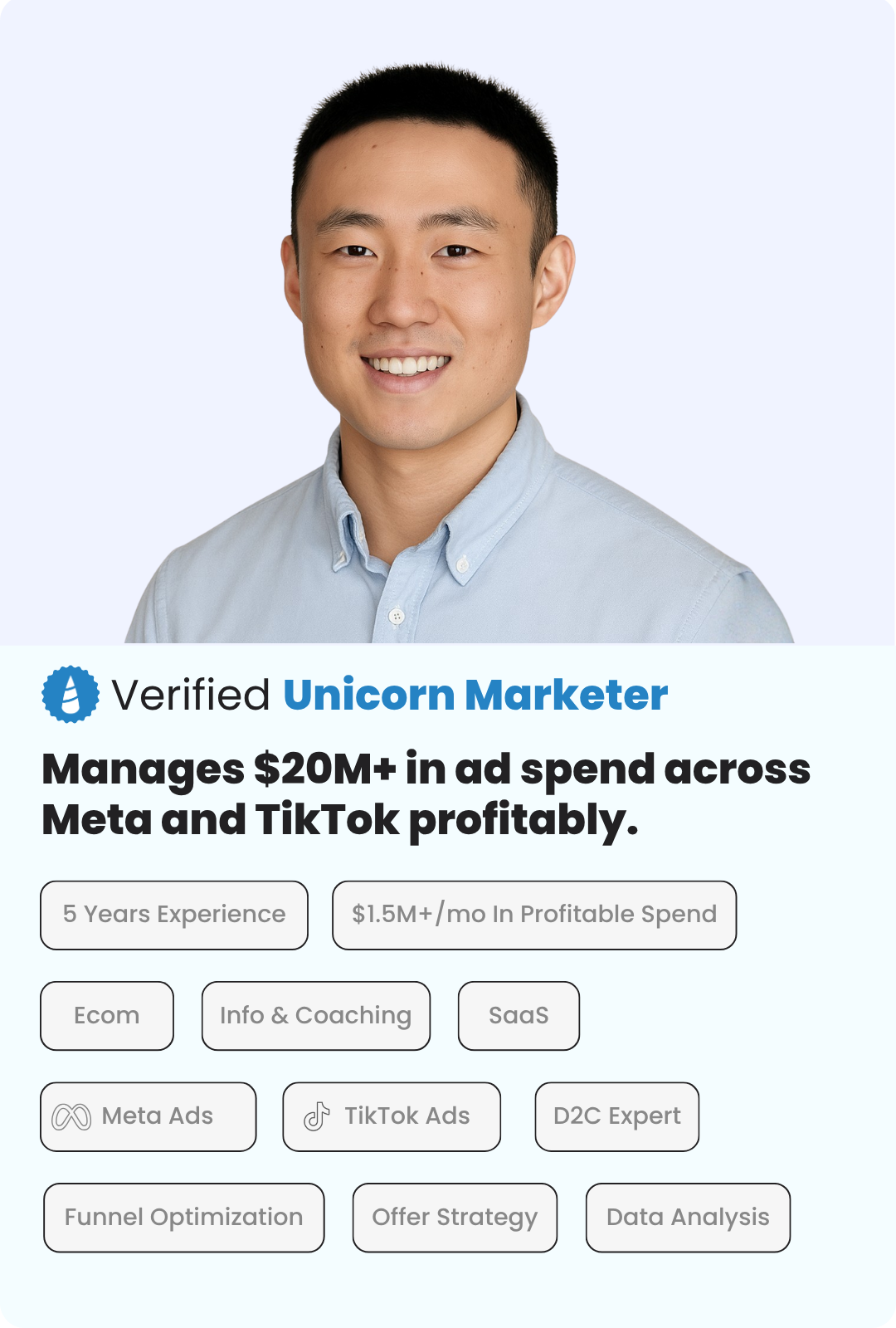 How? Every Unicorn Marketer comes with proven results, having scaled eCommerce, lead gen, SaaS, and info products with millions in verified ad spend across Meta, Google, YouTube, TikTok, LinkedIn, and native platforms. What truly sets them apart is their full-funnel expertise, covering ads, creative, CRO, LTV, and the entire customer journey.